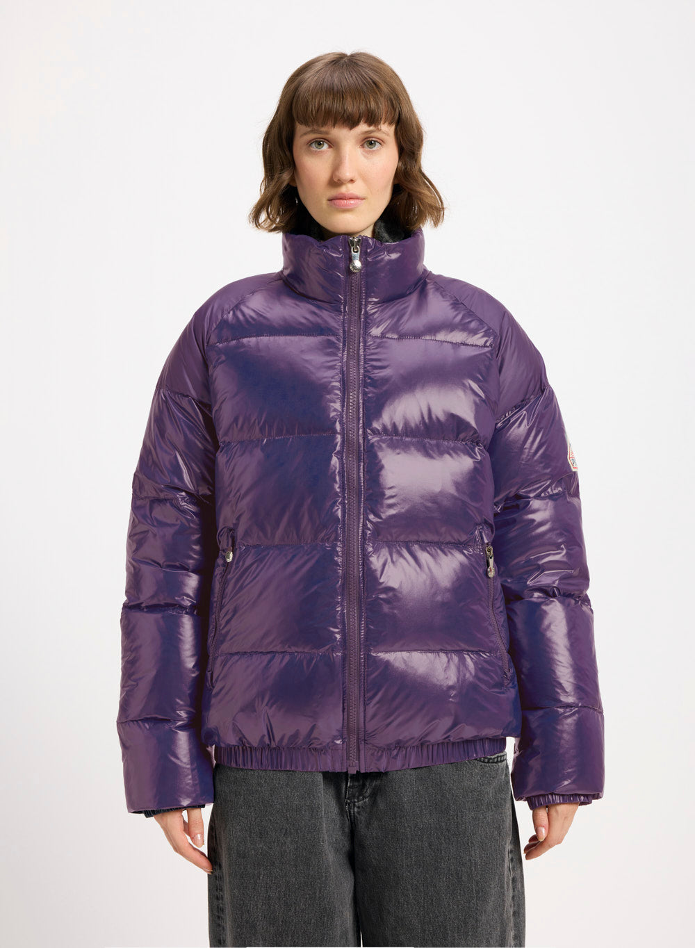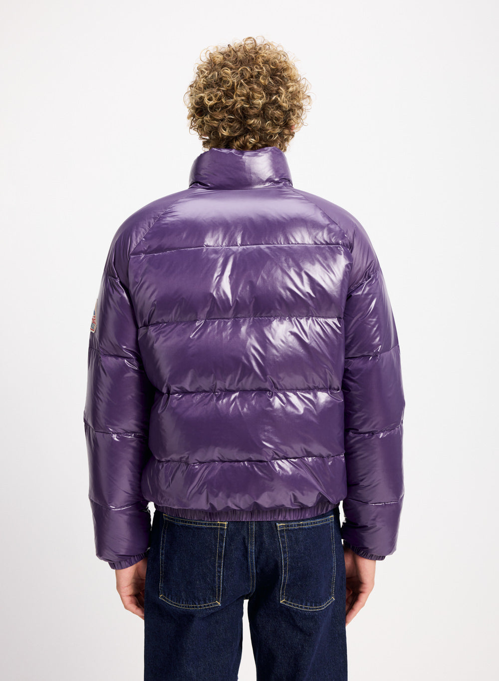 Vintage style down jacket, generous natural down filling, shiny water-repellent fabric and unisex cut.