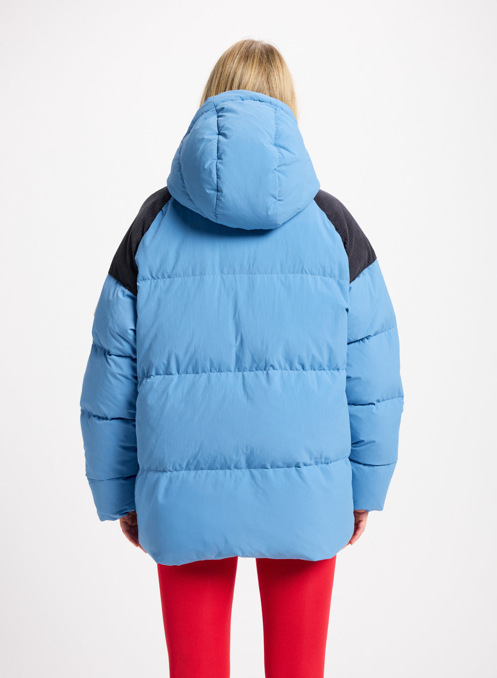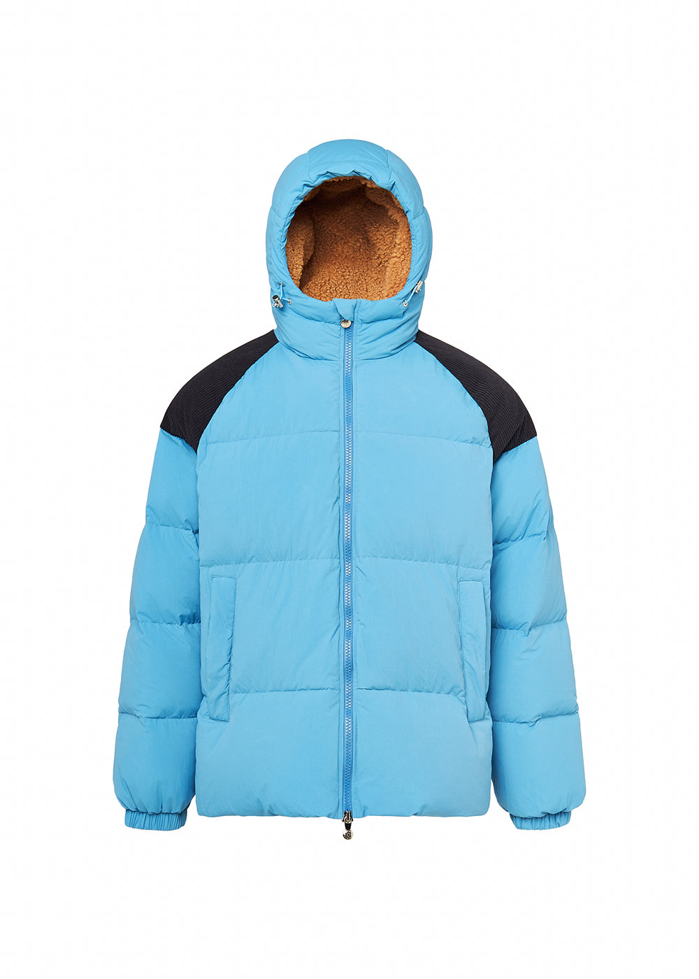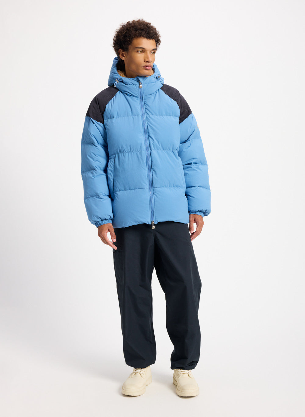 Unisex down jacket with wrap-around hood, velvet shoulder, filled with natural French down.