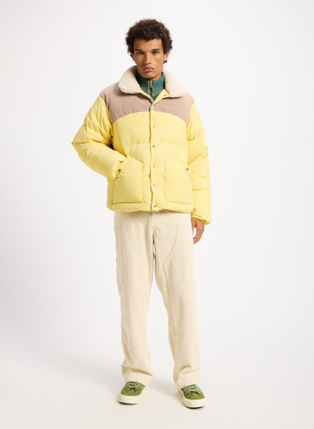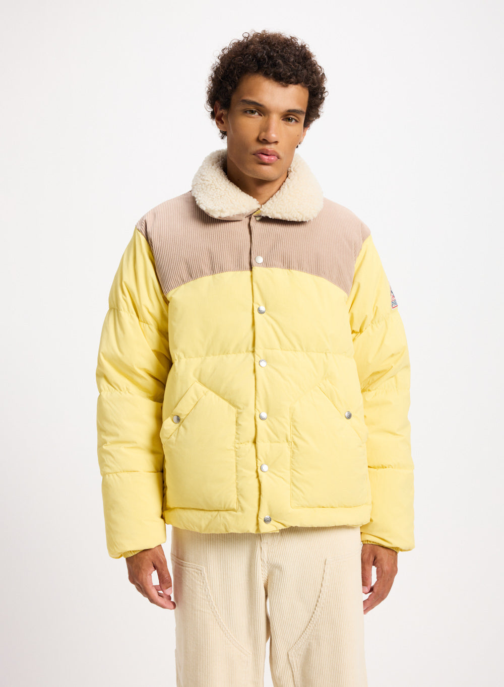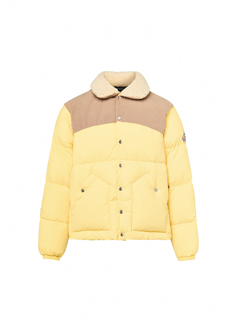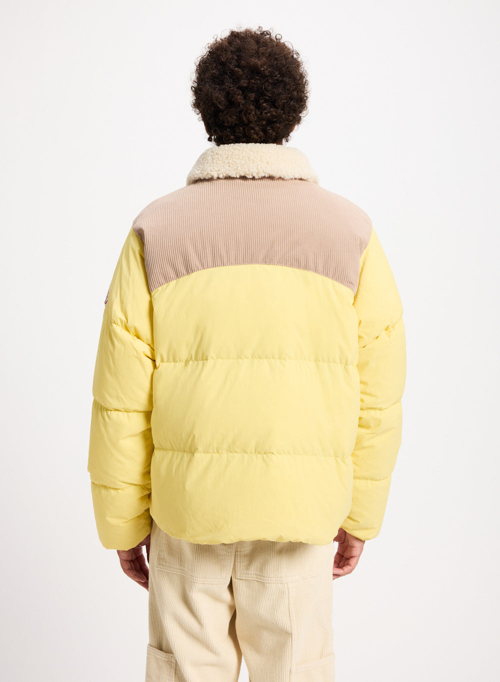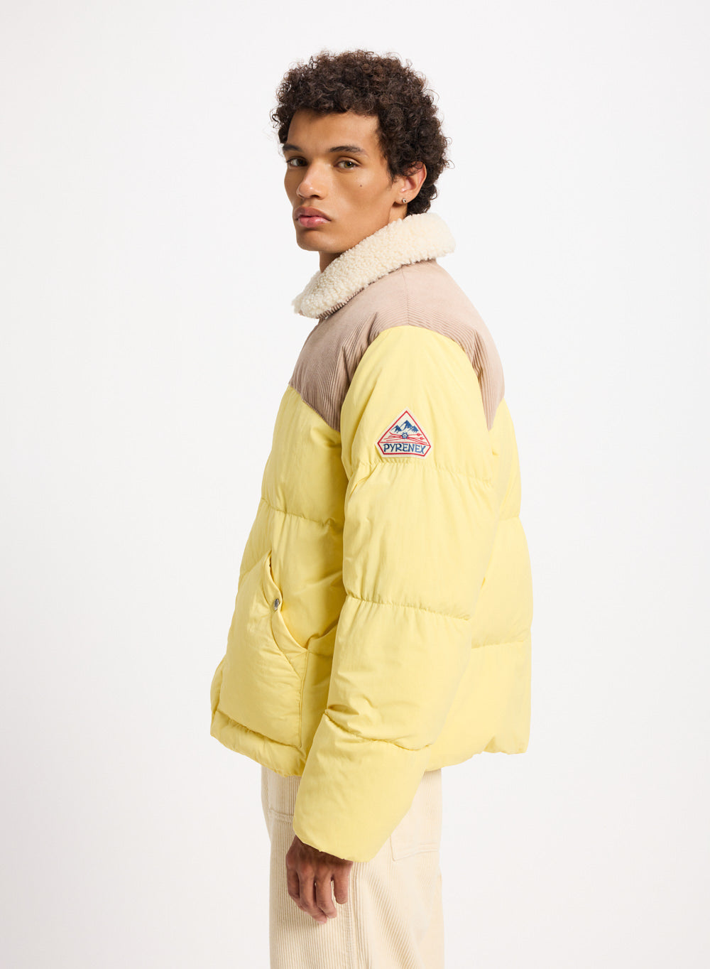 Aviator-style down jacket with sherpa collar and natural down filling.