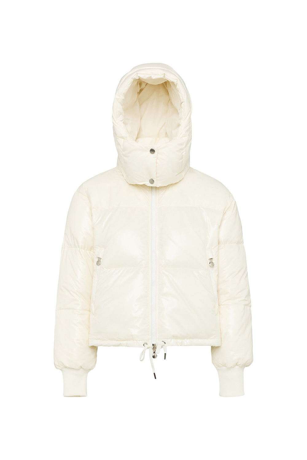 An ultra-fashionable short down jacket with a removable hood and filled with French down.