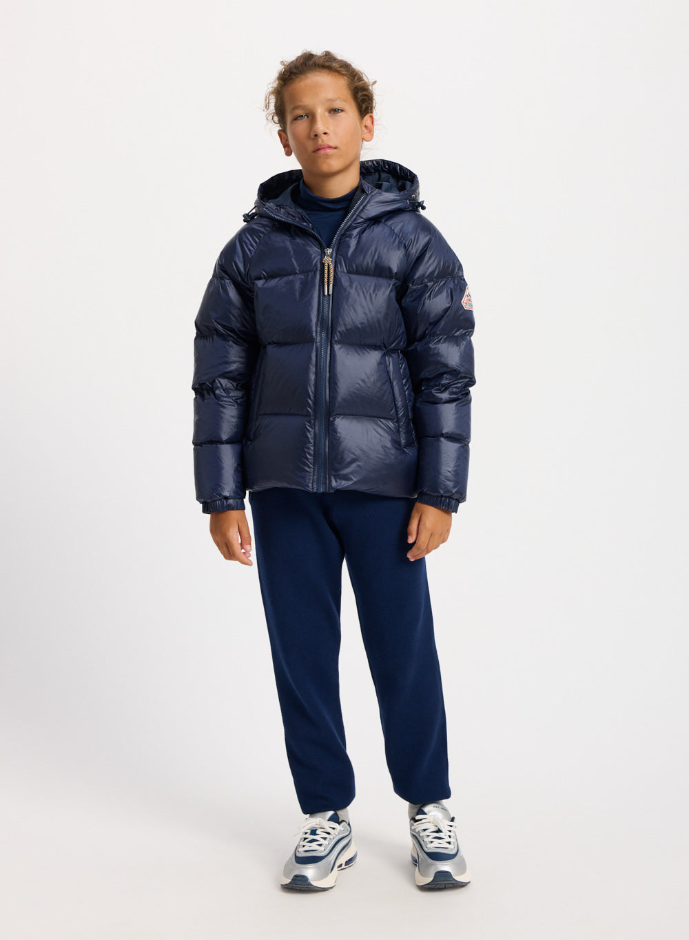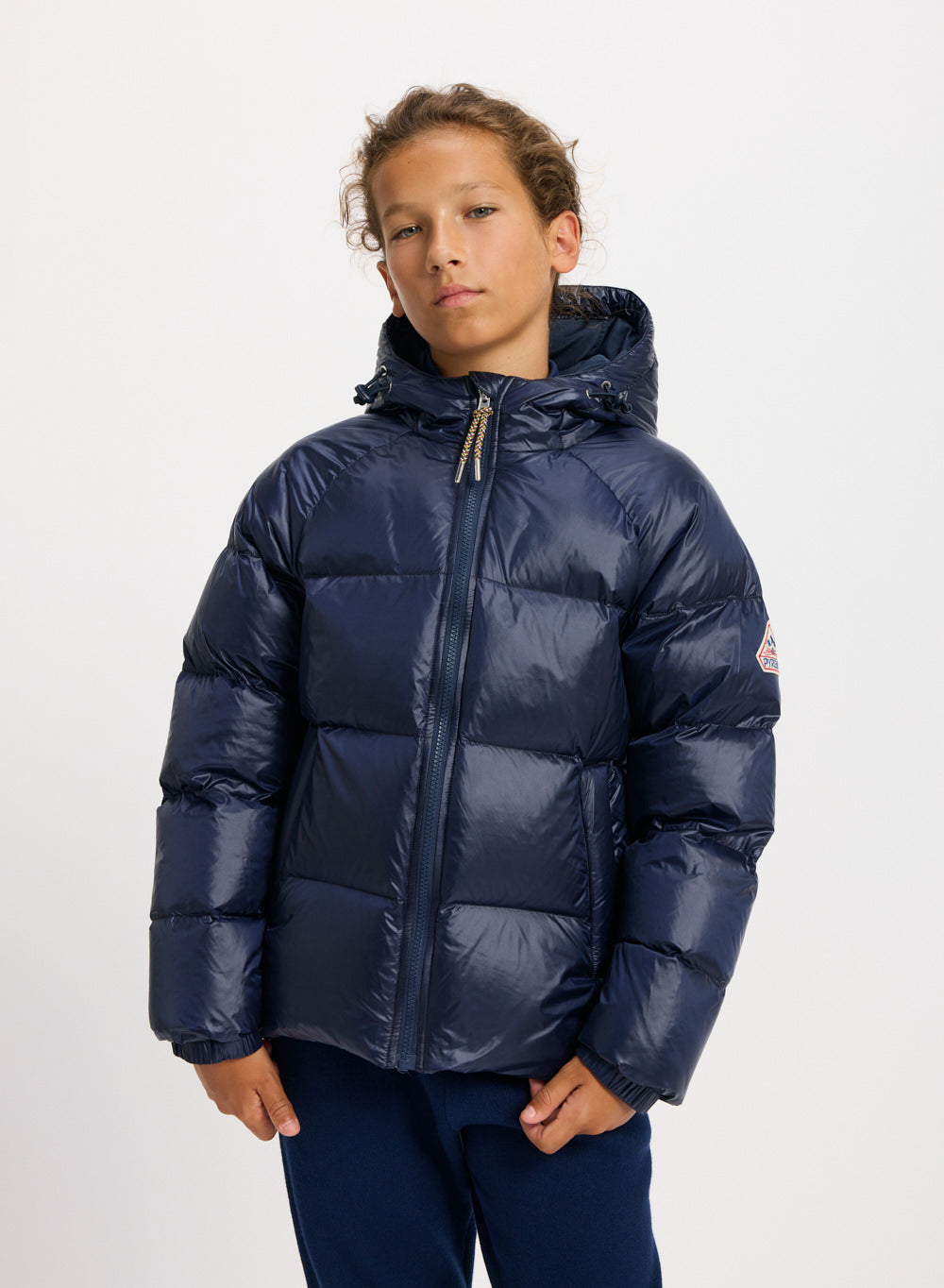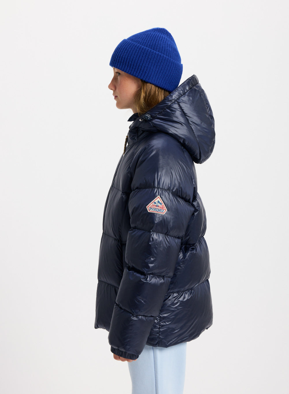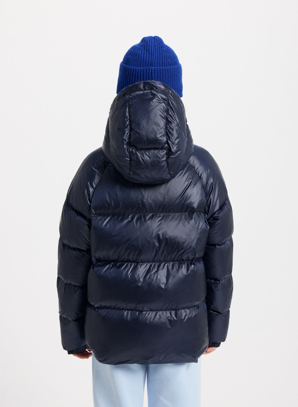 Doudoune à capuche pour enfants en taffetas brillant et duvet naturel.