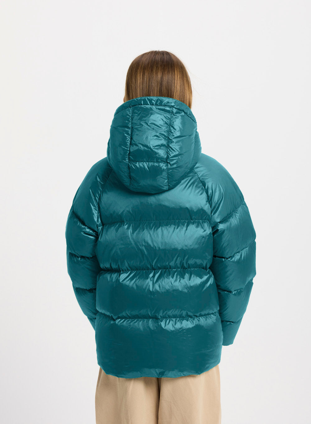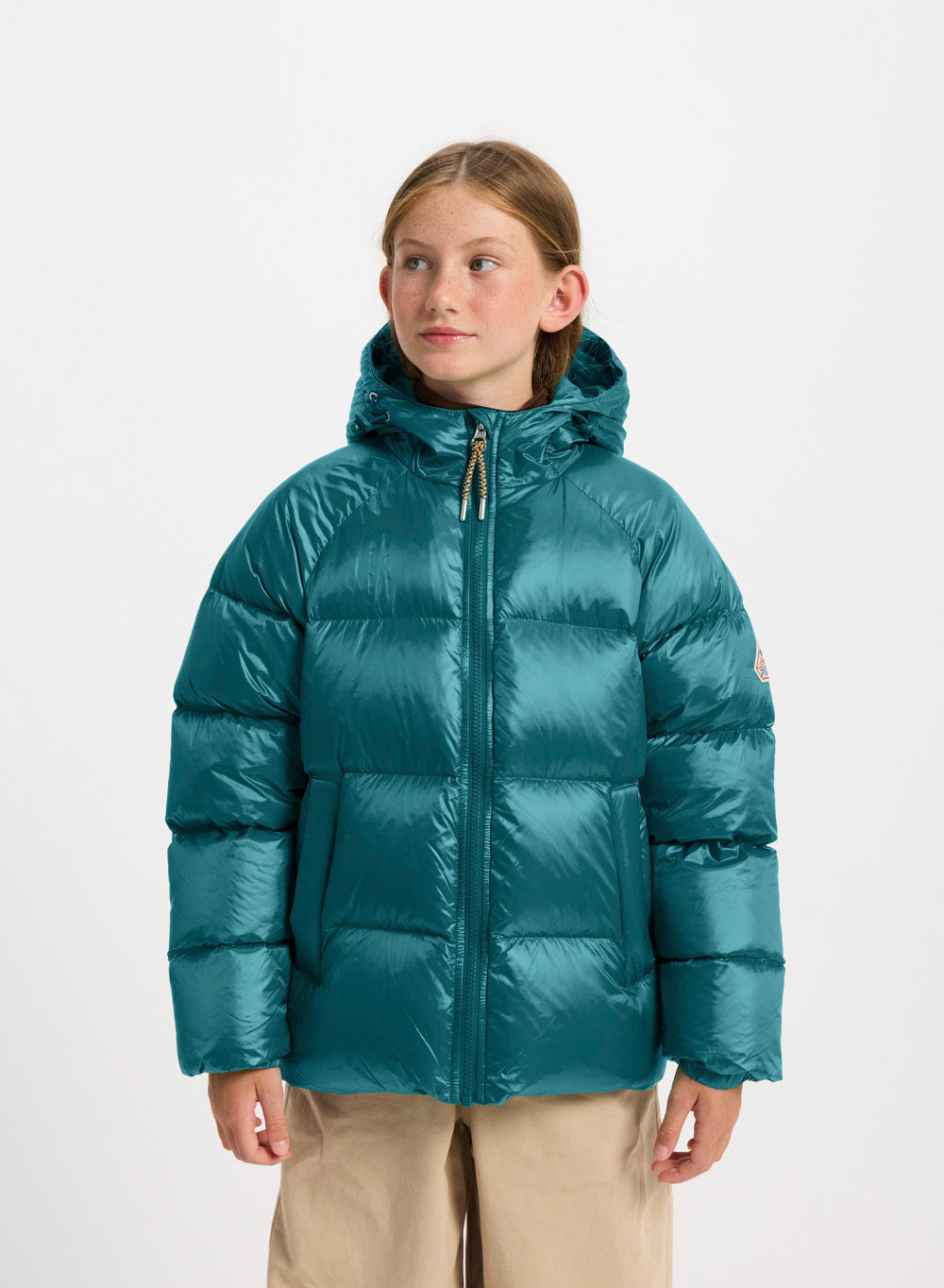 Doudoune à capuche pour enfants en taffetas brillant et duvet naturel.